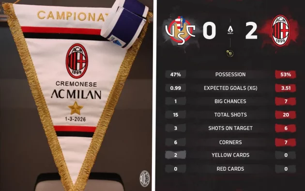 By: Mario Labate Il Milan soffre, ma colpisce al momento giusto e conquista una vittoria pesantissima contro la Cremonese. Allo Zini, i rossoneri sbloccano il match all’89° minuto e chiudono i conti in pieno recupero, imponendosi per 2-0. Con il punteggio ancora fermo sullo 0-0 a un minuto dal novantesimo, il rischio di lasciare punti contro una squadra The post Milan, blitz finale a Cremona: 2-0 e fuga in classifica appeared first on Sempre Milan.
